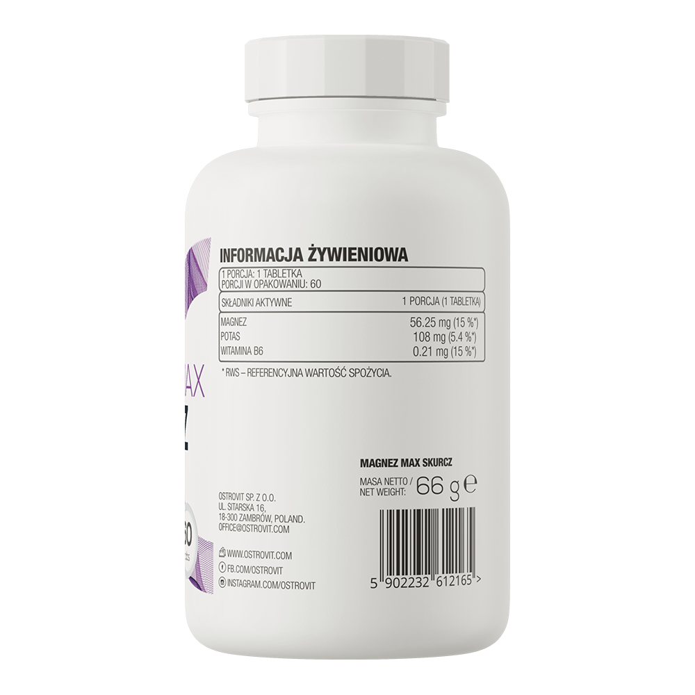 OstroVit Magnesium Max Skurcz egy étrend-kiegészítő, amely magnéziumot tartalmaz magas biohasznosulású formában. Ezenkívül a készítmény káliumot és B6-vitamint is tartalmaz. A termék könnyen lenyelhető tabletták formájában kapható, és fizikailag aktív embereknek és azoknak készült, akik napi étrendjüket értékes összetevőkkel szeretnék kiegészíteni.