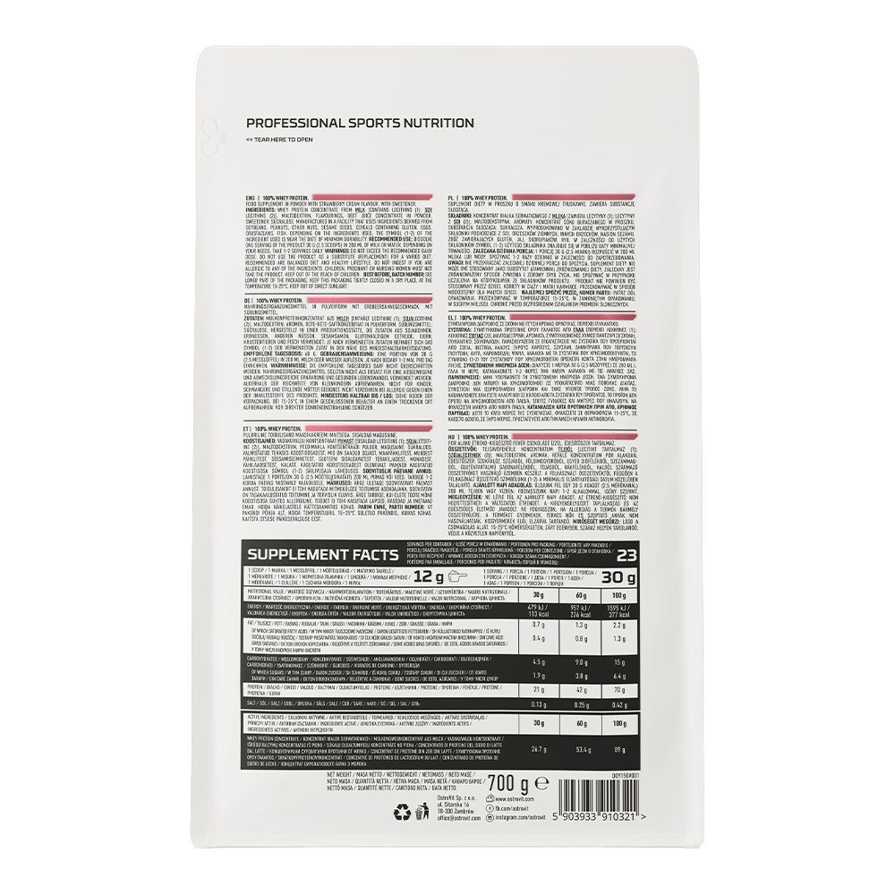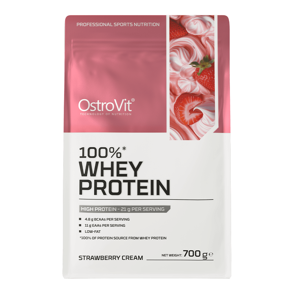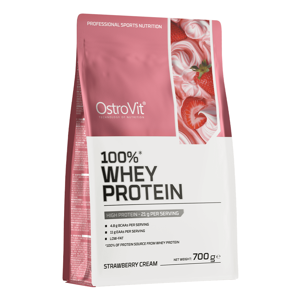OstroVit 100% Whey Protein egy táplálékkiegészítő, amely tejsavófehérje-koncentrátum forrása, és akár 70% kiváló minőségű fehérjét tartalmaz. Ez egy olyan készítmény, amely elágazó láncú aminosavakat (BCAA) és esszenciális EAA aminosavakat biztosít a szervezet számára. Alacsony zsírtartalmú termék, amely por formában, különböző ízekben kapható, és sportolóknak, valamint azoknak készült, akik napi étrendjüket értékes makrotápanyaggal szeretnék gazdagítani.